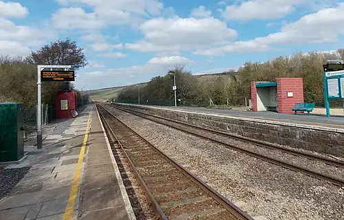 The station was first opened as a temporary wooden platform however on 26 March 1852 Emery of Gloucester was awarded the contract and a stone-built station was constructed of a style repeated all along the line.[3] These station buildings have been demolished and replaced with basic shelters. The station is now unstaffed.