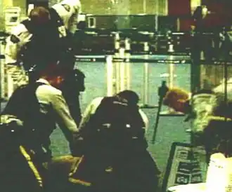 When Dziekański left the customs hall, he became visibly agitated. Bystanders and airport security guards were unable to communicate with him because he did not speak English.[11] He used chairs to prop open the one-way doors between a customs clearing area and a public lounge and at one point threw a computer and a small table to the floor before the police arrived.[13] Four RCMP officers, constables Gerry Rundel, Bill Bentley, Kwesi Millington, and a supervisor, Corporal Benjamin Robinson, arrived and entered the customs room where Dziekański was pacing about. They apparently directed him to stand near a counter, to which Dziekański complied but then he picked up a stapler sometime after being told to place his hands on a counter.[14][15][16]