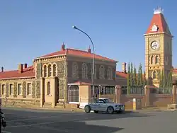 Work on connecting Kimberley by rail to the cities along the Cape Colony's coastline began in 1872, under the management of the Cape Government Railways.[31] The railway line from Cape Town to Kimberley was completed in 1885, accelerating the transport of both passengers and goods.[8] The railway connected Kimberley with cheaper sources of grain and other products, as well as supplies of coal, so that one of its local impacts was to undercut (mainly African) trade in fresh produce and firewood in Kimberley's hinterland.[32] Another footnote to railway history is its role in the initial rapid spread of the Spanish Influenza epidemic in 1918.