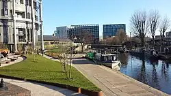 ![]() Repurposed gas holders and canal locks at King's Cross, with the buildings of St Pancras Square behind | |