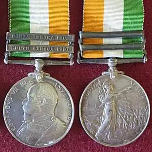 The King's South Africa Medal is a British campaign medal awarded to all British and Colonial military personnel who served in the Second Boer War in South Africa, and who were in the theatre on or after 1 January 1902 and who had completed 18 months service in the conflict prior to 1 June 1902.[1]