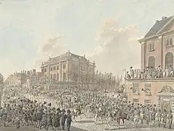 Schimmelpenninck objected to the idea of a regime change. According to him a hereditary head of state was incompatible with the Dutch national character. Napoleon presented on 28 April 1806 an ultimatum to the Dutch diplomats: they had eight days to accept Louis Bonaparte as their king. The majority of the members of the government ratified the treaty without popular consultation.[4] With this Napoleon created a facade of legitimacy. The transition of a republic to a monarchy had actually already been prepared by the one-man rule of Schimmelpenninck.[5]