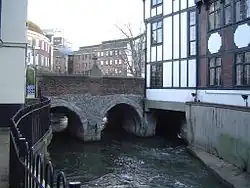 Kingston evolved as a market town from the Saxon period, with goods transported on the Thames and over land via the crossing point.[30] Rights to hold markets were amongst the liberties granted by the royal charter of 1208 and the market formally established in 1242.[31] A horse fair was held at a site on the downstream side of the river north of the bridge and a market extended from there to around the church by the 17th century and further south towards the course of the Hogsmill River. Goods traded included oats, wheat, rye, malt, apples and other fruit, flowers, wool, leather and cheese. Cattle, meat and fish were also traded. The regular Saturday market was supplemented by a Wednesday market in 1662. In addition to markets, regular fairs were held.[31] Local industries included pottery, brick making, tanning, leather-working, fishing, milling, brewing and boat-building.[32][33]