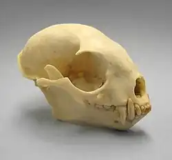 The kinkajou is distinguished from other procyonids by its small, rounded ears, extensible tongue, and prehensile tail. Olingos are similar enough in appearance that many native cultures do not distinguish the two.[19] Compared to olingos, kinkajous are larger, have foreshortened muzzles, and lack anal scent glands (in addition to the previously described differences). The binturong, a Southeast Asian viverrid, has similar limb proportions and is the only other carnivoran with a prehensile tail. The kinkajou resembles neotropical monkeys in having a prehensile tail and big, forward-facing eyes, but has a different dentition and heavy fur on the soles of the feet.[2][17]