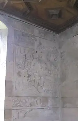 The 16th-century painted interior decoration and a stone armorial carry Arran's ducal coronet, and the collar of the Order of Saint Michael, French honours he received in 1548.[22] An armorial stone has the Hamilton motto, the woodsman's cry, "Through!", and the arms of his wife, Margaret Douglas, with her motto "Lock Sickar", meaning secure or steadfast. The stone was formerly set on the north pavilion of the main block, and is now displayed with other carved stones in a cellar. One of the painted rooms has decoration that evokes verdure tapestry with vignettes of Samson and Delilah, Abraham and Isaac, and David and Bathsheba and The Temptation of St. Anthony; this vaulted room is now called the Arbour Room. The other room has scenes from the Parable of the Good Samaritan, Lucretia, Saint Jerome and Mary Magdalene. The original use of this suite of rooms is unknown, although they were probably the principal bed chambers. The name of the painter seems be unrecorded, and it has been suggested a French painter in Edinburgh, Guillaume, was involved.[23] The subjects of these paintings allude to the Power of Women, perhaps a political reference to Mary of Guise, Mary Queen of Scots and the two Tudor Queens of England.