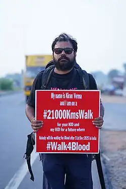 Kiran Verma (born 27 December 1984) is an Indian social activist and social worker. He is the founder of Simply Blood.[2][3] Currently, he is on a 21,000 kilometres (13,000 mi) walk for Blood Donation Awareness.[4][5][6]