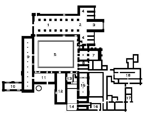 The cloister to the south (5) occupies the whole length of the nave. On the east side stands the two-aisled chapter house (7), between which and the south transept is a small sacristy, and on the other side two small apartments, one of which was probably the parlour (8). Beyond this is the calefactory or day-room of the monks. Above this whole range of building runs the monks' dormitory, opening by stairs into the south transept of the church.[4]
