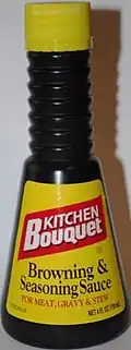 Kitchen Bouquet is a browning and seasoning sauce primarily composed of caramel with vegetable flavorings. It has been used as a flavoring addition for gravies and other foods since the late 19th century.[3] It is currently produced by the Hidden Valley or HV Food Products Company.