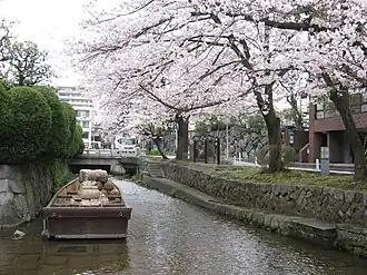 Kiyamachi Street (木屋町通, Kiyamachidōri) is a historical street in Kyoto, Japan, running north–south. It runs between Kiyamachi Nijō and Kiyamachi Shichijō on the eastern side of the Takase River near the Kamo River. There also runs Nishi-Kiyamachi Street on the western side of Takase River between Sanjō and Shichijō. It was constructed with the excavation of Takase River in the Edo period. Kiya is an old Japanese word which means woods stores. In 1895 a tram started to run between Kiyamachi Nijō and Kiyamachi Gojō. The tram line was moved to Kawaramachi Street in 1920s.