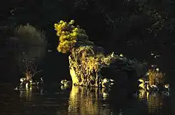 The pond has three islands, one of which is connected with a bridge. There are iso-watari — this term refers to the stepping stone pathways that lead across shallow parts of the pond. When crossing the pond using iso-watari, one can view the fish in the pond. It teems with carp, turtles, and waterfowls. Its location near the river and the bay attracts a large number of birds. There are over 4000 trees in this constricted space. Japanese Black pine (Pinus thunbergii) are the dominant trees. Purple azaleas, Hydrangea macrophylla, Iris ensata and Taiwan cherry (Prunus campanulata) provide seasonal color.