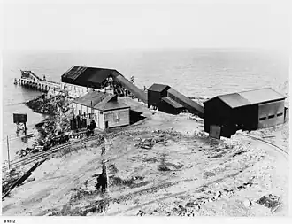 The jetty was built in 1920 by the South Australian Harbors Board on a lease back agreement. It was the first reinforced concrete piled jetty in South Australia, measuring 79 metres (259 feet) long with a depth of 3.3 metres (11 feet) at low water. It was widened to 1927, and altered again in 1953. In 1965 a T section was added to improved loading facilities.[4] It now measures 150 metres (490 feet) long with a depth of 6.5 metres (21 feet).[5]