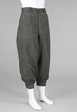 Knickerbockers, or knickers in the United States (US), are a form of baggy-kneed breeches, particularly popular in the early 20th-century United States. Golfers' plus twos and plus fours are similar. Until after World War I, in many English-speaking countries, boys customarily wore short trousers in summer and "knee pants" similar to knickers in winter. At the onset of puberty or sometime in their teens,[1] they graduated to long trousers. In that era, the transition to "long pants" was a major rite of passage.[2] Men continued to wear knickerbockers for athletics, outdoor work, and other informal activities for which they were practical. During the early 20th century, knickerbockers were also increasingly worn by women.