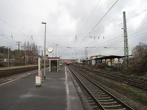 The eastern platform is located on the West Rhine line and is served by MittelrheinBahn (RB 26) services, all other services on the left bank line pass through without stopping. The western platform is located on the Neuwied–Koblenz railway and is served by the Rhein-Erft-Bahn (RB 27); however, the extended RheingauLinie (RB 10) runs between Koblenz City Centre Station and Neuwied without stopping.