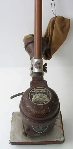 The range of accessories was expanded extensively after the war.[18][19] From the 1950s onwards, Vorwerk set up subsidiaries, agencies and sales offices abroad, for example in the United States, South America and Japan.[20] In 1953, the threshold of one million Kobold appliances produced was exceeded.[15] In 1953,[21] the Kobold was also given the typical green and white colors of the time.[15][22] In 1973, the 10 million mark was reached, in 1989 the 50 million mark.[15] In 2011, Vorwerk launched the Kobold robot vacuum cleaner,[21] three years later the window vacuum cleaner,[23] and in 2018 the cordless vacuum cleaner.[21]