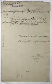 Aleksey Petrovich Kobyzev, the son of Pyotr Prohorovich Kobuzev, a landlord of Argunovo hamlet, Zaraysk district, served at St. Peter fortress on the Siberian line (now the city of Petropavl, Kazakhstan) as a 13th class commissary of the Commisariat staff,[10] which did not allows of getting the official noble status. In 1801 he attempted to prove nobility of his family by approaching the noble assembly of the Ryazan governorate asking them to research the nobility of his father's family in the archives. The case took three years. The assembly failed to find anything on the family in the archives, apart from that his father actually owned a manor at Argunovo. However, it wasn't enough and the noble assembly rejected to accept Aleksey Kobuzev in Ryazanian nobility. Thus, the family was not included to the genealogical book of Ryazan, as was then required for families claiming hereditary nobility through their ancestry. The file containing the investigation of Aleksey's case is currently at the State Archive of the Ryazan Oblast (fonds 98, series 16, file 5).[11]