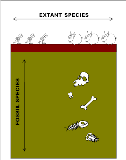 The "vertical" dimension concerns the fossil record. Fossil species are frequently remarkably stable over extremely long periods of geological time, despite continental drift, major climate changes, and mass extinctions.[32][33][34] When a change in form occurs, it tends to be abrupt in geological terms, again producing phenotypic gaps (i.e. an absence of intermediate forms), but now between successive species, which then often co-exist for long periods of time. Thus the fossil record suggests that evolution occurs in bursts, interspersed by long periods of evolutionary stagnation in so-called punctuated equilibria.[32] Why this is so has been an evolutionary enigma ever since Darwin first recognized the problem.[23][34][35]