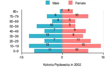 According to the 2002 Poland census, there were 149 people residing in Kolonia Pęcławska village, of whom 48.3% were male and 51.7% were female. In the village, the population was spread out, with 30.2% under the age of 18, 32.9% from 18 to 44, 18.1% from 45 to 64, and 18.8% who were 65 years of age or older.[1]