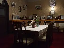 From 1933 to 1934, a new wing of the house was constructed on the previous site of the garden: a Western reception room and seven Japanese-style rooms. One of the users of the reception room was Isoroku Yamamoto. As of 2012, this room is a museum with historic materials related to the Japanese navy.[17] Seven Japanese-style rooms are composed of various woods such as Paulownia tomentosa, rosewood, Chamaecyparis obtusa, maple and pseudocydonia. The Momiji (Japanese maple or Autumn leaf color in general) Room was top-grade and used by various admirals such as Isoroku Yamamoto. The room came to be known as the chokan-beya (the Admiral's room).[18] In the second floor of the new wing is a large room as large as 160 mats. Komatsu Yamamoto, the first mistress, used to appear in Japanese-style parties until she was 88 in 1935. She was given a gala 88th year birthday party. Then, she retired and died at age 94 in 1943.[19]