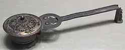 - a Kamakura period censer or incense burner made by gilted copper casting, measuring 36.0 cm (14.2 in) (total length), with a handle width of 2.1 cm (0.83 in) and a container measuring 8.1 cm (3.2 in) (height) by 10.3 cm (4.1 in) (diameter). The lid is thought to be a later addition and has a design with Japanese morning glory. The censer is in custody at the Tokyo National Museum.