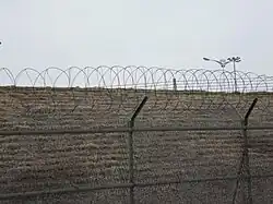 A 2007 Reuters report revealed that there is no coast-to-coast wall located across the DMZ and that the pictures of a "wall" which have been used in North Korean propaganda have merely been pictures of concrete anti-tank barriers.[34] While 800,000 landmines were being removed in 2018, it was shown that the Joint Security Area along the Korean border was guarded by standard barbed wire.[35]