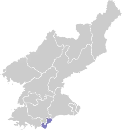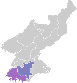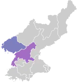 Hwanghae Province has been divided into South Hwanghae Province and North Hwanghae Province since 1954. Thanks to the wide Yonbaek and Chaenyong plains, Hwanghae province is a granary of North Korea and is known for its good quality cereal production.[33] As the millet seeds produced in the region are thick, and have a good taste, they are eaten as much as barley is consumed by people of the southern region. The abundant production of cereal crops provides quality feed for livestock, so the quality of meat produced in the region is said to be good. Chicken raised in every household is fleshy and of good quality, and is used for many dishes in Hwanghae cuisine. It is used as an ingredient for wheat noodle dishes, and mandu (dumplings). The coastal area, adjacent to the Yellow Sea, produces a lot of salt because the tideland in the area is developed and there is little rainfall.[33] Due to the climate, kimchi in the Hwanghae region has a clear and refreshing taste, so its brine is used as a soup on many occasions. Dongchimi brine is used as a broth for naengmyeon (cold buckwheat noodle dish), or for mixing with a bowl of chilled rice to make a midnight snack. The Hwanghae people are known for kindheartedness and rustic simplicity, so their cuisine reflects their nature. Hwanghae dishes are savory and simple, with less decoration such as mandu made in a larger size than other regions. The general taste is moderate, similar to that of Chungcheong province.[3]