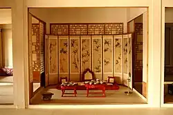 The sura (수라) were the main meals of the day. Breakfast was served at ten in the morning and the evening meals were served between six and seven at night. The set of three tables (surasang, 수라상), were usually set with two types of rice, two types of soup, two types of stew (jjigae), one dish of jjim (meat stew), one dish of jeongol (a casserole of meat and vegetables), three types of kimchi, three types of jang (장) and twelve side dishes, or called 12 cheop (12첩). The meals were set in the surakan (수라간), a room specifically used for taking meals, with the king seated to the east and the queen to the west. Each had their own set of tables and were attended by three palace servant women known as sura sanggung (수라상궁). These women would remove bowl covers and offer the foods to the king and queen after ensuring that the dishes were not poisoned.[6]