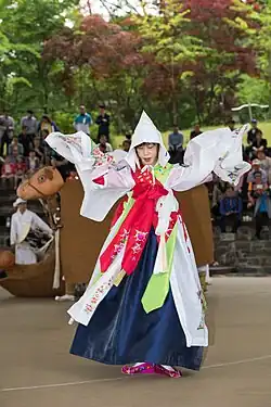 The costumes worn for these rituals are called sinbok.[315] These colorful outfits resemble those documented from the 19th and early 20th centuries,[316] and may involve a hanbok.[317] The mansin may distinguish themselves from their assistants by having their hair in the Tchokchin mŏri style.[269] For the gut, the mudang will dress in clothes representing the deities,[318] with different deities associated with different items of clothing.[315] They may change outfit over the course of the gut to reflect the different entities possessing them.[319] This is not a practice that the sesup mu engage in.[271]