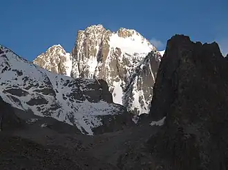 Korona Peak (Russian: пик Корона, romanized: Pik Korona, lit. 'Crown Peak') is a mountain in the Kyrgyz Ala-Too Range of the Tian Shan. It is located in Ala Archa National Park in Kyrgyzstan.[1] It is named for its crown-like appearance.
