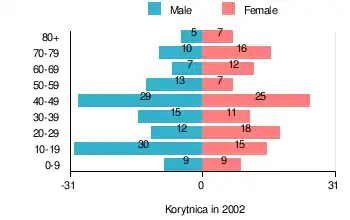 According to the 2002 Poland census, there were 250 people residing in Korytnica village, of whom 52% were male and 48% were female. In the village, the population was spread out, with 21.2% under the age of 18, 36.8% from 18 to 44, 20.4% from 45 to 64, and 21.6% who were 65 years of age or older.[1]