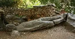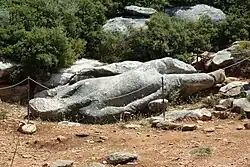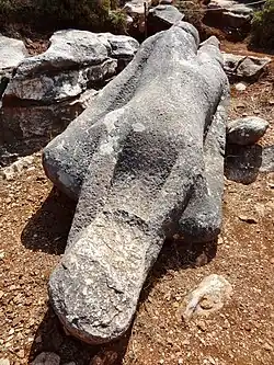 The kouros in the quarry, also known as the Kouros of Potamia or the Kouros of Faranga, is located about halfway up a 300 metre high marble outcrop and is 5.0 metres long. This statue is also unfinished and its legs are also broken off, probably as a result of being dropped at the quarry during transport, in the spot where it still remains. The figure lies on its back, away from the rock from which it was originally cut.[2] Further issues are visible. The face is missing, clear scratches are visible on the foot stumps. The roughly worked feet of the figure lie nearby, mounted on a much more recent concrete foundation.