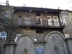 Jews in the Kraków ghetto were required to wear a Star of David on their arm, identifying them as being Jewish, which led to the revoking of most rights.[22] A curfew was implemented that stripped Jews of many opportunities to participate in the cultural life.[27] As time went on, Jews needed to obtain permits in order to enter and exit the ghetto, robbing them of any freedom they felt they had left at this point.[27] Even though the Jews were unable to participate in certain areas of cultural life in the Kraków ghetto, "various cultural and religious activities continued within the ghetto."[28] Although the practice of religion was banned, that did not stop those in the Kraków ghetto from praying and staying true to Judaism.[29] At least three synagogues or other religious facilities were still in use that served as a place for the Jews to go to and pray.[28] There was also a café where artists played live music within the ghetto, which proved to be instrumental in keeping Jews' spirits up. Finally, there was a ghetto pharmacy, which was a place where people could go to discuss problems, read underground and official newspapers and learn the realities of what was happening and what atrocities they were living through.[28] Numerous songs were created by those living in the ghetto, serving three major purposes: "documentation of ghetto life, a diversion from reality, and the upholding of tradition."[30] These songs portrayed their immense suffering coupled with their dedication and determination to survive. Some of the most popular lyrics are "Me hot zey in dr’erd, me vet zey iberlebn, me vet noch derlebn" ("To hell with them, we will survive them, we will yet survive"),[30] conveying and sharing the feelings of the Jewish people through music. Laughter, which was a rarity in the Kraków ghetto, was another way numerous victims attempted to cope with their strong hatred for the enemy.[30] Sometimes prisoners performed ghetto songs, while other times small groups performed them with various instruments.[30] Street songs are a sub-genre of ghetto music with four dominant themes: hunger, corrupt administration, hope for freedom and a call for revolt.[30] Music has always been a traditional and important aspect of both Jewish holidays and Jewish home life more generally. The prisoners in the Kraków Ghetto did their best to keep this tradition alive, especially during Passover and Yom Kippur.[30] Although music brought some comfort to many, suicide rates were significantly higher among the musicians than other camp workers. Many of the musicians were forced to watch the murder of their families and friends due to the Nazi's insistence that the prisoner-musicians play music while the other prisoners were marched to the gas chambers.[30]