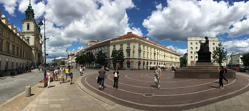 Krakowskie Przedmieście (Polish) (Polish pronunciation: [kraˈkɔfskʲɛ pʂɛdˈmjɛɕt͡ɕɛ] , lit. ⓘ 'Kraków Fore-town') is one of the best known streets of Poland's capital Warsaw, surrounded by historic palaces, churches and manor-houses. It constitutes the northernmost part of Warsaw's Royal Route, and links the Old Town and Royal Castle (at Castle Square) with some of the most notable institutions in Warsaw, including, proceeding southward, the Presidential Palace, Warsaw University, and the Polish Academy of Sciences headquartered in the Staszic Palace.[1] The immediate southward extension of the street along the Royal Route is New World Street.