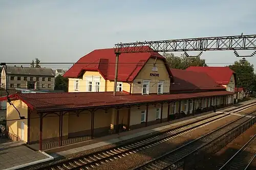 The railway station at Krasne was opened in 12 July 1869 as part of the 92-kilometre (57 mi) Lviv–Krasne–Brody line of the Karl Ludwig Railway.[4][1] A branch from Krasne to Ternopil was completed in 1870.[4][5] This branch was extended further east in 1871 to Pidvolochysk and then to Volochysk in the Russian Empire.[4]
