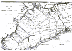 Krimpenerwaard obtains its name from the fact that "Krimp" used to mean a bend in a river and "Waard" is the Dutch word for an interfluvial area between the winter dikes of different river channels (in this case, the Lek and the Hollandse IJssel).[4] There are other such waarden in this area. The Lopikerwaard lies to the east; the Zuidplaspolder to the west. The name Krimpenerwaard first appeared in the historical records in 944.