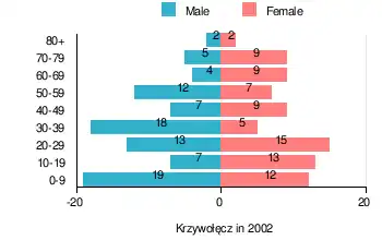 According to the 2002 Poland census, there were 168 people residing in Krzywołęcz village, of whom 51.8% were male and 48.2% were female. In the village, the population was spread out, with 28.6% under the age of 18, 38.1% from 18 to 44, 17.3% from 45 to 64, and 16.1% who were 65 years of age or older.[1]