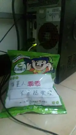 Kuai Kuai culture is a phenomenon in Taiwan wherein people put snacks of the brand Kuai Kuai (Chinese: 乖乖; pinyin: guāiguāi; Wade–Giles: kuai1kuai1) next to or on top of machines. People who do this believe that, because the name of the snack—"Kuai Kuai"—stands for "obedient" or "well-behaved," it will make a device function without errors.[1] As such, it can be commonly found in myriad places of work in Taiwanese society. A rigid set of best practices has arisen surrounding the proper use of Kuai Kuai snacks, such as using green bags only, and ensuring the snacks are not expired.[2]