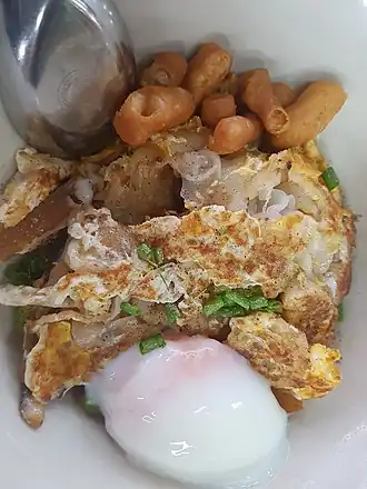![]() Kuaitiao khua kai served with a poached egg and deep-fried doughsticks | |