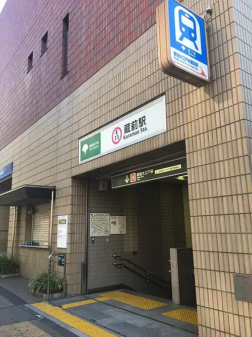 Kuramae Station (蔵前駅, Kuramae-eki) is a subway station located in the Kuramae and Kotobuki neighborhoods of Taitō, Tokyo, Japan. It serves the Toei Asakusa Line and Toei Oedo Line, both of which are operated by the Tokyo Metropolitan Bureau of Transportation (Toei). The station is identified as A-17 on the Asakusa Line and E-11 on the Ōedo Line. While there is no underground connection between the two lines, passengers can transfer between them at ground level.