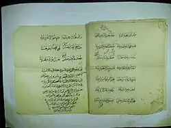 The earliest "proper 'text'" written in Kurdish[4] is a Kurmanji translation of a Christian prayer in Armenian letters, copied between 1430 and 1446 and preserved in an Armenian manuscript. Besides this, the earliest written works in Kurdish are from the 16th and 17th centuries.[5] Information about the earliest Kurdish poets is incomplete. The dates for authors given by Mahmud Bayazidi, once the sole source for the subject, are not considered reliable. Little information survives about Ali Hariri,[2] whom Bayazidi dated to the 15th century but who, according to Thomas Blois, should be placed later.[6] Melayê Cizîrî (1570–1640) is said to have been the founder of a school of Kurmanji poets who wrote in the sub-dialect of Jazira/Bohtan. Cizîrî left behind a large number of poems, including qasidas (odes) and ghazals (lyrics), some of which are still popular. Feqiyê Teyran (1590–1660) was supposedly Cizîrî's student. He also wrote qasidas and ghazals, and he was the first known Kurdish poet to write narrative poems using the mathnawi (couplet) form.[2] His Hikayeta Şêxê Sen'an (The story of Sheikh Sen'an) is a well-known epic poem.[7]
