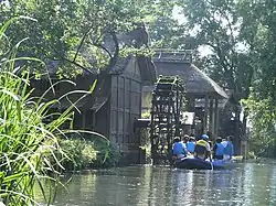 Dreams was initially composed of 11 sequences, but was trimmed down to nine before filming began.[11][19] Nearly three months into shooting, the ninth sequence was also abandoned.[11] Nogami said this was due to the ninth segment and its on-location shooting in the United States being estimated to cost $3 million of the film's $14 million budget.[19] Titled "A Wonderful Dream", the cancelled final sequence featured "I" having breakfast in a foreign hotel when he hears a loud commotion and turns on the television to see announcers from various countries reveal that humanity has staved off nuclear extinction with a global peace treaty having been signed.[19] He looks out a window to see crowds of people throwing guns and other weapons into a pile while shouting for joy. In a move similar to the fourth wall-breaking scene of Kurosawa's One Wonderful Sunday (1947), the film was set to end with the viewing audience being called upon to join in with the applause.[19] Coppola even gave Kurosawa some advice on how to save money for the long shots of crowds by cutting cork into human shapes and placing them in flowing water to simulate jostling and shoving. Nogami said Kurosawa found the idea interesting, but never actually tested it.[19] With the scrapping of "A Wonderful Dream", "The Village of the Water Mills" segment was moved from sixth place, to the film's last.[19] In an interview with Nobuhiko Obayashi, Kurosawa described another sequence he really wanted to make that featured the asura at Kōfuku-ji coming to life and juggling the Temple of the Golden Pavilion, Kiyomizu-dera and others while its three faces argue with each other, before deciding to watch the moon rise at Mount Wakakusa.[13] But the director said the "issues of the Kyoto temples aren't global problems."[13] Jim Bailey of the Los Angeles Times reported that another sequence was scrapped due to how much it would cost to use special effects to make people appear to be flying.[11]