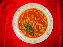 Kuru fasulye is a stewed bean dish in Turkish cuisine.[1][2] It is made primarily with white beans and olive oil, and onion and tomato paste or tomato sauce are almost invariably used. Sometimes other vegetables or meat may also be added, especially pastirma. Kuru fasulye is often served along with cacık and rice or bulgur. It is often considered the national dish of Turkey.[3][4]