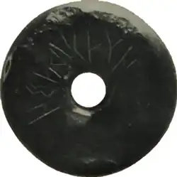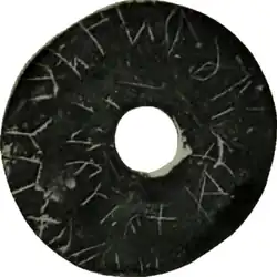 Two coal spindle whorls inscribed with Old Turkic script and diameters between 3.5–6 cm[20] were discovered north of Lake Baikal. The first spindlewhorl was found outside of Narin-Kunta. During the 1910s the location was the primary Kurumchi dig site.[30] Donner and Räsänen[31] presented a translation of the first spindle whorl subsequently accepted by most researchers.[32][33][34][35] The second spindle whorl was discovered by farmers plowing a field near Shokhtoy. Donner and Räsänen were only able to distinguish some of the eroded characters. They offered "the fifth of the snowy month" and "the fifth month of the arqar year" as partial translations.[36] Gavriil Ksenofontov,[37] S. E. Malov,[38] Hüseyin Orkun,[35] and Louis Bazin[39] subsequently have offered their own translations. In 2019 Tishin made a comprehensive translation of the Shokhtoy spindle whorl.[40] Both spindle whorls have become lost, with only photographs remaining.[41] An assistant and student of Petri, Gavriil Ksenofontov,[29] characterized both spindle whorls as random discoveries found by non-archaeologists.[42] In particular, as the Shokhtoy spindle whorl was discovered by chance outside an organized excavation, Ksenofontov didn't believe the Kurumchi created the item.[43]