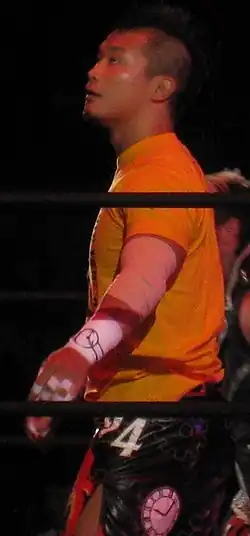 Kushida joined Nobuhiko Takada's Takada Dojo during his junior high school years, where he started learning both pro wrestling and mixed martial arts (MMA) under Takumi Adachi.[3] He had his MMA debut five years later for ZST, defeating Kenji Mizuno by disqualification after the latter grabbed the ropes to defend a takedown. Kushida followed his debut with a draw, a win, and a three-match tournament victory at the 2004 ZST Genesis Lightweight Tournament.[3] Around the same time, he held a part-time job with the Tokyo Sports magazine[4] and began attending Senshu University.[3]