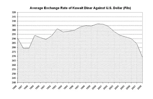 From 18 March 1975 to 4 January 2003, the dinar was pegged to a weighted currency basket. From 5 January 2003 until 20 May 2007, the pegging was switched to US$1 = KD 0.29963 with margins of ±3.5%.[13] The central rate translates to approximately KD 1 = US$3.53.