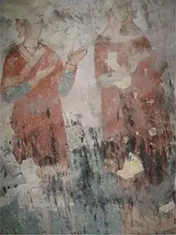 The basilica contains remnants of medieval wall painting. Of note is a 12th–13th-century fresco in the northern wall of the southern nave, depicting a young man and a woman, identified by the accompanying medieval Georgian asomtavruli text as Shota and Ia, respectively. The fresco is reproduced in a repoussé work on the iron gate handmade in 1987.[5] Shota was not an uncommon name among the local aristocracy. One popular hypothesis identifies the man from the Kvabiskhevi fresco with the poet Shota Rustaveli, who penned the epic Knight in the Panther's Skin.[6]