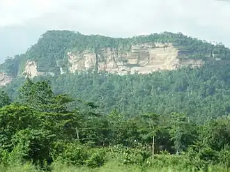 The Kwahu Plateau is a 260 km (160 mi) long plateau in southern Ghana. It consists of the uplifted southern edge of the Volta River Basin. It forms the main watershed of Ghana, separating rivers in the Volta River system from rivers in the western half of Ghana which flows into the Atlantic Ocean (Birim, Pra, Ankobra). The plateau has an average elevation of 1,500 feet and its highest point is Mount Akmawa at 2,586 feet. The plateau is dissected by several valleys and is marked by towering peaks. To the south it borders dense forest country, which it shields from the harmattan winds of the interior. Cacao cultivation has been introduced in the west, through which traditional trade routes lead to the Atlantic; vegetable cultivation is stressed in the eastern sector. The largest and most important towns on the Kwahu Plateau are Wenchi, Mampong, Mpraeso, and Abetifi.[1]