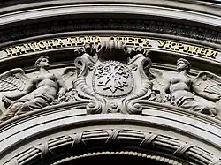 The exterior is decorated with rosettes and masks.[9] The Greek muses Melpomene and Terpsichore, made by the sculptor Emilio Sala, are above the entrance.[15] The building has a curved façade decorated with stucco work and narrow, deep arches. It was planned that Kyiv's coat of arms, along with the city's patron saint, the Archangel Michael would be placed on the roof above the entrance.[1] After protests from the Metropolitan of Kyiv, Theognostus who declared that placing an image the saint would be blasphemy.,[22] an allegoric composition consisting of griffins holding a lyre was used instead.[1]