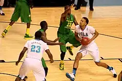 Anderson committed on September 19, 2011, to attending University of California, Los Angeles (UCLA) to play Division I basketball for the Bruins.[9] He had also considered Seton Hall, Georgetown, Florida and St. John's. A major factor in his decision was UCLA coach Ben Howland's record of grooming successful point guards in the National Basketball Association (NBA).[13] Anderson and Muhammad were the top players in the Bruins' recruiting class, which was considered the best in the nation.[14][15] Howland had Anderson mostly playing off the ball, while Larry Drew II was the Bruins' primary ball handler.[16] Playing primarily as a power forward,[16][17] Anderson finished the season with averages of 9.7 points, 8.6 rebounds and 3.5 assists.[18] Though he struggled at times under Howland's strict offense,[19] he led the team in rebounding and was the only player ranked in the top 10 in the Pac-12 in both rebounds and assists.[2][20] He was the first Pac-12 player since UCLA's Bill Walton as a senior in 1973–74 to have at least 300 rebounds and 100 assists in the same season.[21] Anderson was named to the All-Pac-12 second team and the Pac-12 All-Freshman team.[22] Projected by NBA executives to be chosen in the first half of the second round of the 2013 NBA draft if he declared himself eligible, Anderson gave major consideration to leaving college.[18]