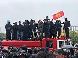 The protests began on 5 October 2020, with a crowd of 1,000 people,[7] that grew to at least 5,000 people by evening in Bishkek (the capital of Kyrgyzstan) in protest against results and allegations of vote-buying in the October 2020 parliamentary election.[8] After nightfall, following a police operation to clear the Ala-Too Square of protesters with tear gas and water cannons, protesters allegedly attacked police officers with rocks and injured two of them.[19][20] Former President Almazbek Atambayev was freed from prison.[21]