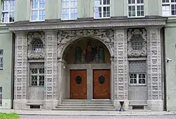 Entrance to the Munich police headquarters built 1910–1913. - March 1914: The Munich police has moved into its new headquarters. Adolf Hitler, a young painter from Austria, comes in to have his permit of residence extended. Lederer and novice Dannenberger are detached to monitor a speech held by socialist Rosa Luxemburg.